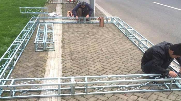 簡介—— 1、先在地上大致的位置擺好四個底座,調(diào)節(jié)好下面的支腿,使之在一個水平面;2、在四個角上的底座的外側(cè)插入斜支撐底下的部分,
